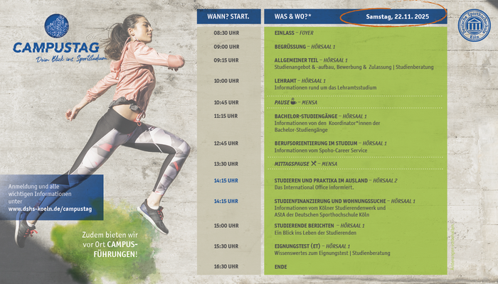 Du bist sportinteressiert und überlegst, ein sportwissenschaftliches Studium zu beginnen? Du hast schon von der Deutschen Sporthochschule Köln gehört, weißt aber noch nicht genau, was es für ein Studienangebot gibt? Dann besuche unseren nächsten Campustag! Wir freuen uns, dich auf unserem schönen Campus begrüßen zu dürfen. Für alle, die nicht kommen können, bieten wir die wichtigsten Inhalte auch im Livestream an.