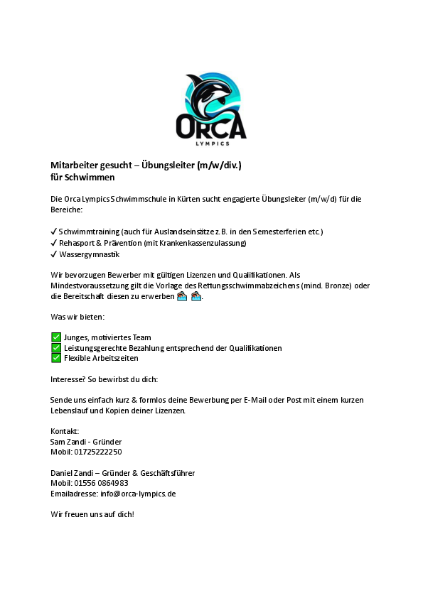 Die Orca Lympics Schwimmschule in Kürten sucht engagierte Übungsleiter (m/w/d) für die Bereiche: