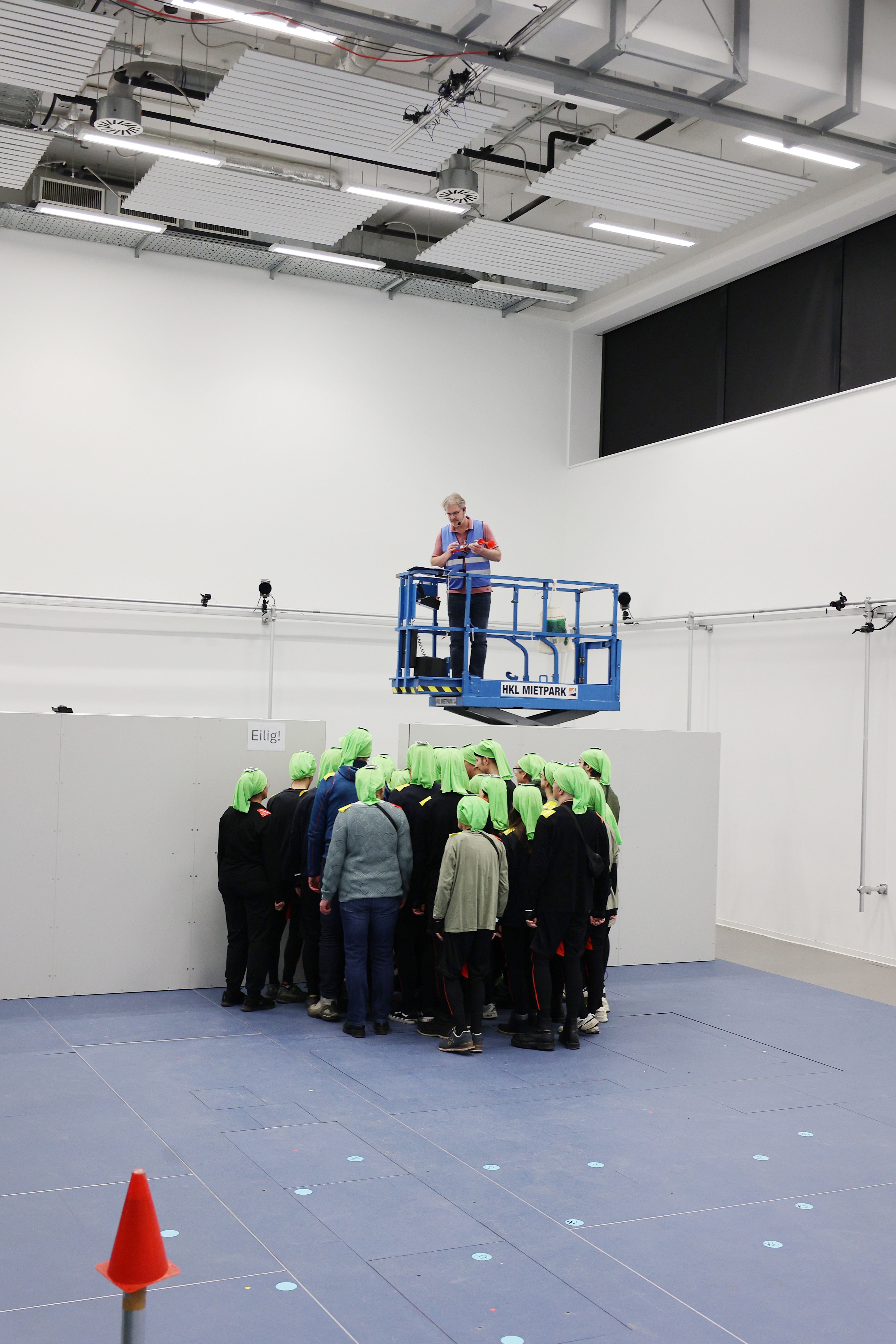 Unter der Decke montierte Kameras erfassen die Laufwege jeder einzelnen Person. Einige Probandinnen und Probanden sind zusätzlich mit 3D-Bewegungssensoren sowie Sensoren zur Messung der Herzfrequenz ausgestattet und liefern den Forschenden weitere, detaillierte Einblicke in das Geschehen. Ergänzend fließen individuelle Faktoren wie Körpergröße oder Fitness in die Auswertung ein, um ein möglichst umfassendes Bild der entstehenden Dynamik zu gewinnen.