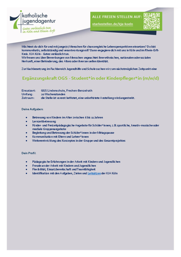 Möchtest du dich für und mit junge(n) Menschen für chancengleiche Lebensperspektiven einsetzen? Du bist kommunikativ, selbstständig und verantwortungsvoll? Dann engagiere dich mit uns in Köln und im Rhein-Erft-Kreis. KJA Köln - Gutes verlässlich tun.