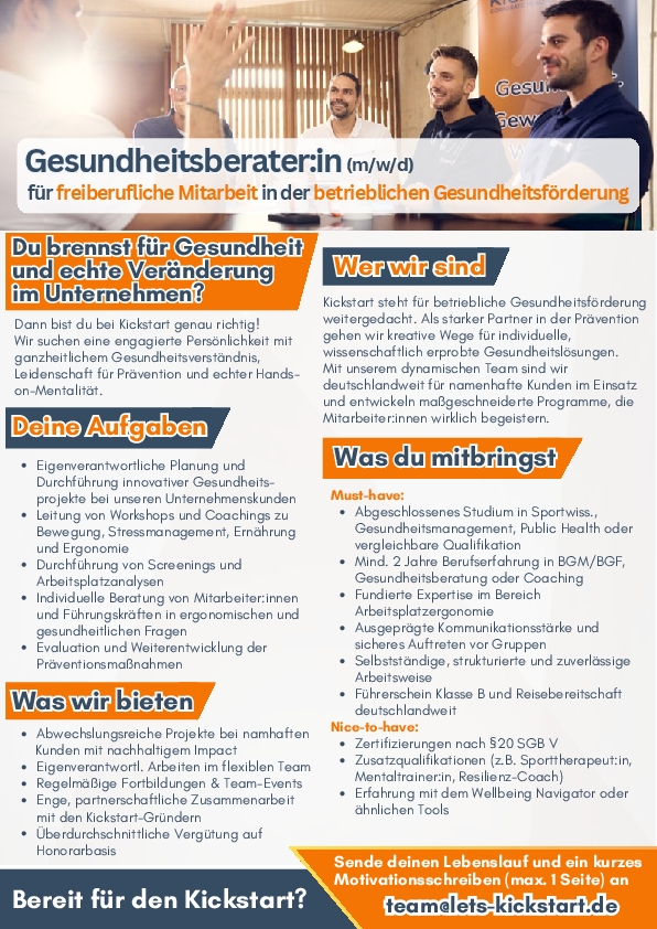 Wenn du Teil unseres Teams werden möchtest und deine Leidenschaft für Gesundheit und Wohlbefinden mit unseren Kunden teilen willst, dann bewirb dich jetzt! Sende deinen Lebenslauf und ein kurzes Anschreiben an team@lets-kickstart.de. Weitere Informationen findest du auf lets-kickstart.de