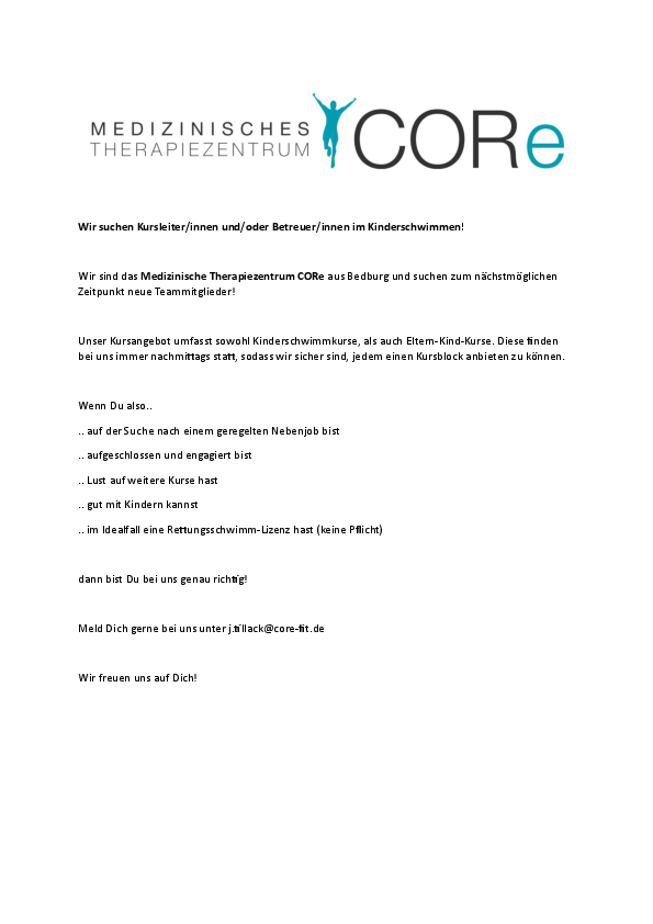 Wir sind das Medizinische Therapiezentrum CORe aus Bedburg und suchen zum nächstmöglichen Zeitpunkt neue Teammitglieder!