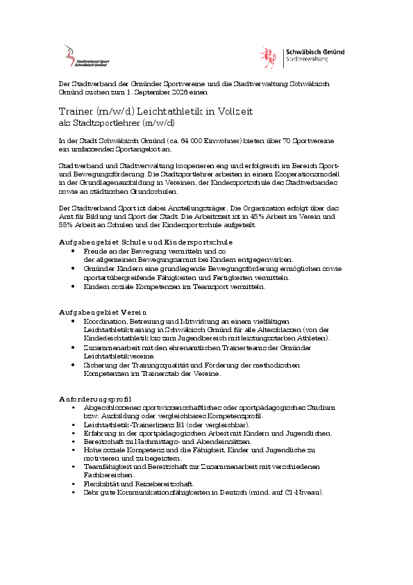 Wir freuen uns über Ihre Bewerbung bis 08.05.2026 über das Bewerberportal der Stadt Schwäbisch Gmünd: www.schwaebisch-gmuend.de oder www.stadtverband-sport-gd.de