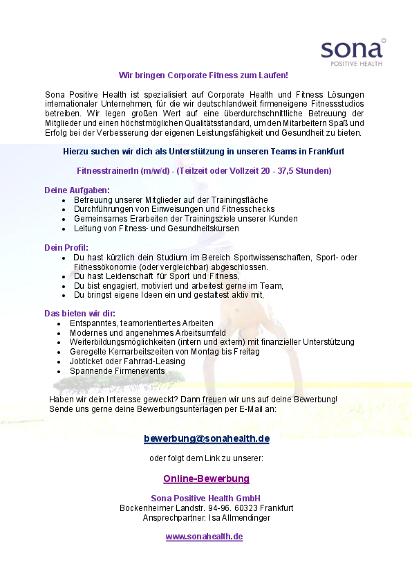 Wir bringen Corporate Fitness zum Laufen! Komm zu uns ins Team! Sona Positive Health ist spezialisiert auf Corporate Health und Fitness Lösungen internationaler Unternehmen, für die wir deutschlandweit firmeneigene Fitnessstudios betreiben. Wir legen großen Wert auf eine überdurchschnittliche Betreuung der