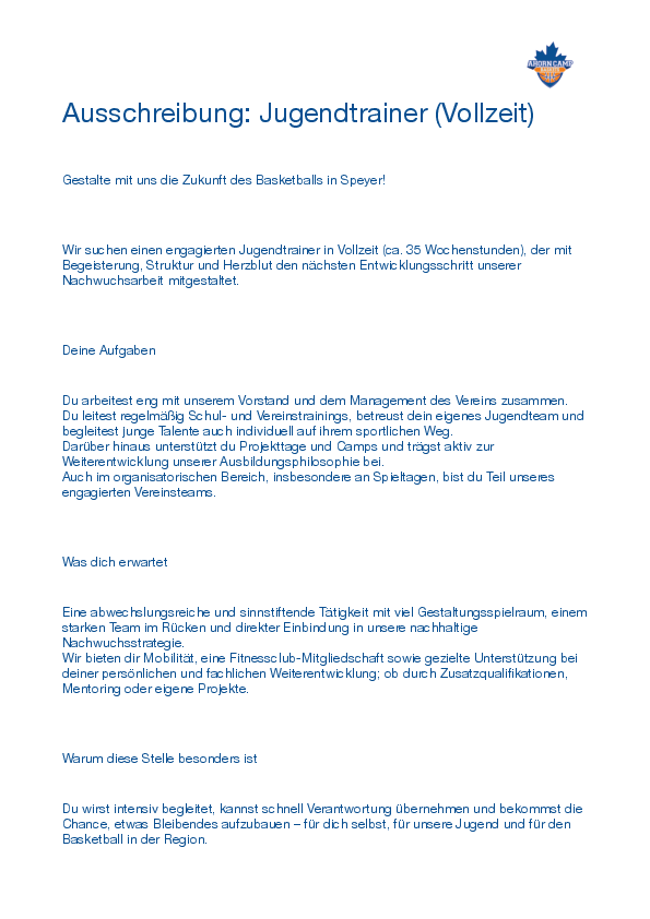 Die Ahorn Camp Baskets Speyer suchen ab sofort einen engagierten Basketballtrainer in Vollzeit mit etwa 35 Wochenstunden.
