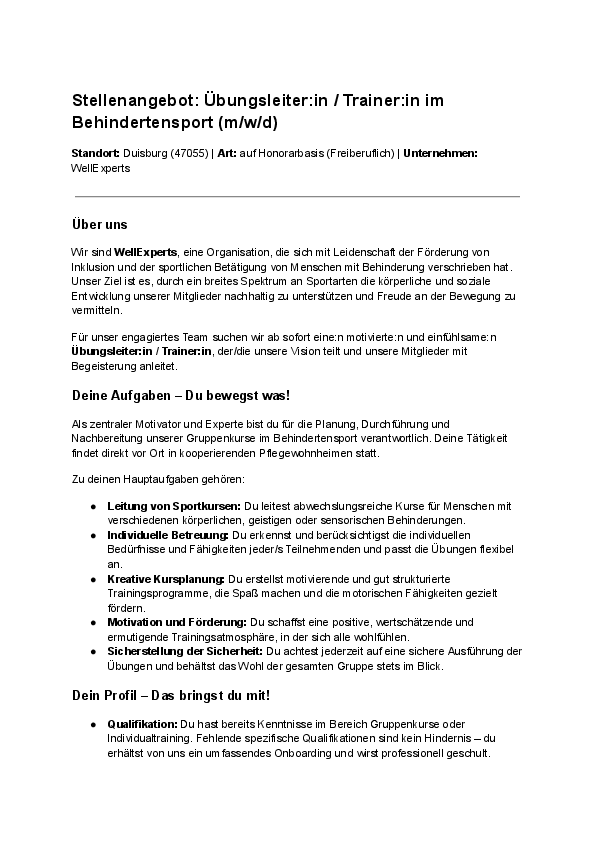 Standort: Duisburg (47055) | Art: auf Honorarbasis (Freiberuflich) | Unternehmen: WellExperts