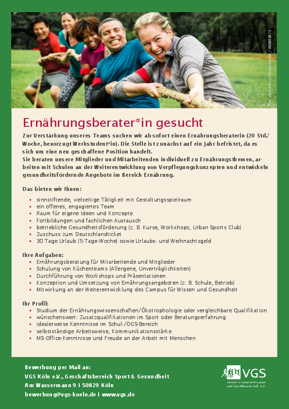 Zur Verstärkung unseres Teams suchen wir ab sofort eine*n Ernährungsberater*in (20 Std./Woche, bevorzugt Werkstudent*in). Die Stelle ist zunächst auf ein Jahr befristet,