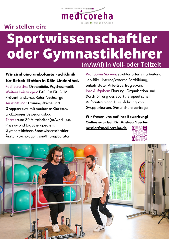 medicoreha sucht Sportwissenschaftler oder Gymnastiklehrer (m/w/d) in Voll- oder Teilzeit