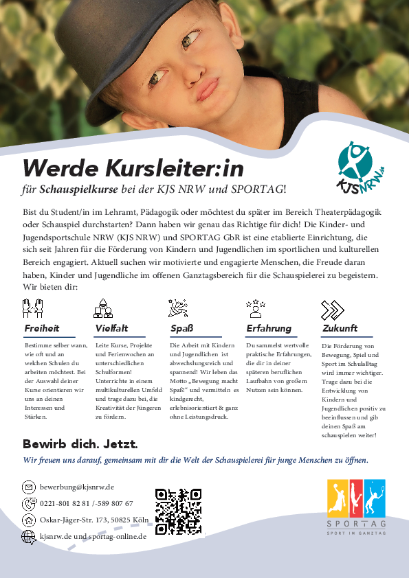 Die Kinder- und Jugendsportschule NRW (KJS NRW) und SPORTAG GbR ist eine etablierte Einrichtung, die sich seit Jahren für die Förderung von Kindern und Jugendlichen im sportlichen und kulturellen Bereich engagiert. Aktuell suchen wir motivierte und engagierte Menschen, die Freude daran haben, Kinder und Jugendliche im offenen Ganztagsbereich für die Schauspielerei zu begeistern.