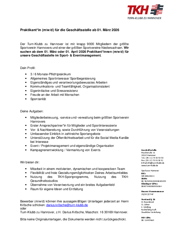 Der Turn-Klubb zu Hannover ist mit über 9000 Mitgliedern der größte Sportverein Hannovers und einer der größten Sportvereine Niedersachsen. Wir suchen ab dem 01. März 2026 oder ab dem 01. April 2026 Praktikant*innen (m/w/d) für unsere Geschäftsstelle im Sport- & Eventmanagement.