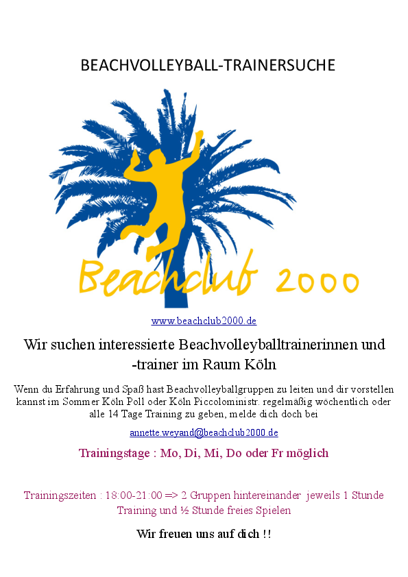 Der Beachclub2000 e.V. sucht ab 01.05. Trainer für ein regelmäßiges Training in Köln wöchentlich oder 14-tägig an folgenden Standorten