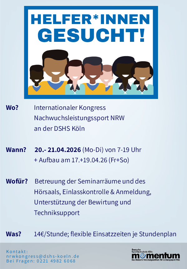 Für den internationalen Kongress Nachwuchsleistungssport an der DSHS suchen wir Helfer:innen. Der Kongress findet vom