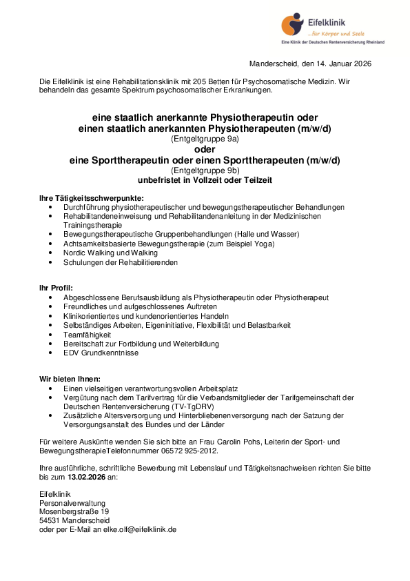 Für weitere Auskünfte wenden Sie sich bitte an Frau Carolin Pohs, Leiterin der Sport- und BewegungstherapieTelefonnummer +49 6572 925 2012.