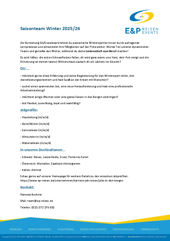 Schau gerne auf unserer Homepage für weitere Details zu den einzelnen Jobprofilen: www.ep-reisen.de/unternehmen/karriere-job-reisen/jobs-in-den-bergen/winter-saisonteamer/