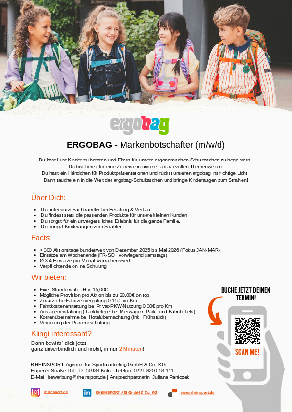 Du hast Lust Kinder zu beraten und Eltern für unsere ergonomischen Schultaschen zu begeistern.