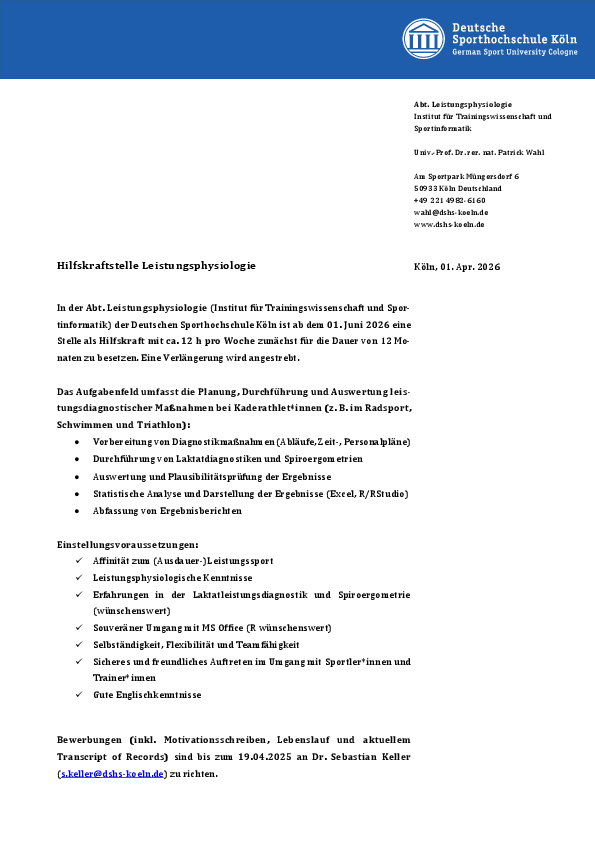 In der Abteilung Leistungsphysiologie (Institut für Trainingswissenschaft und Sportinformatik) der Deutschen Sporthochschule Köln ist ab dem 01. Juni 2026 eine Stelle als Hilfskraft mit ca. 12 h pro Woche zu besetzen.