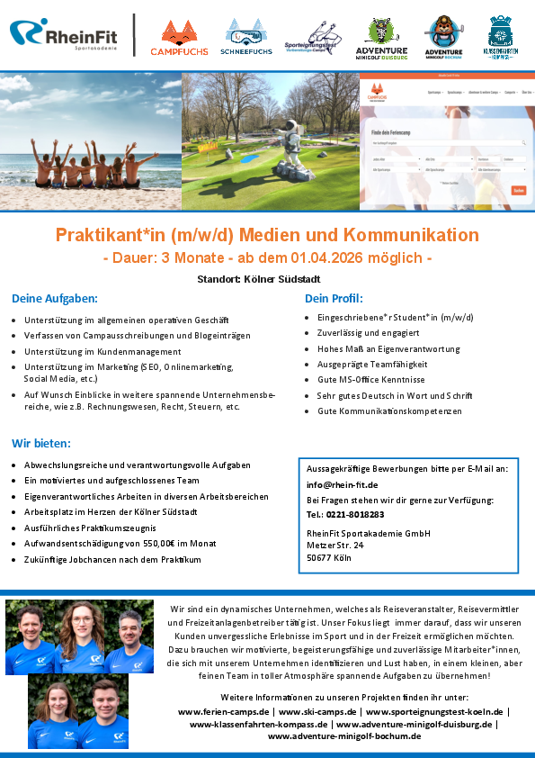 Mit unseren Projekten - dem Campfuchs, dem Schneefuchs, den Sporteignungstest Vorbereitungscamps, dem Klassenfahrten Kompass und unseren Adventure Minigolfanlagen in Duisburg und Bochum - sind wir ein dynamisches Unternehmen im Bereich des Sport- und Freizeittourismus. Wir suchen für unser Büro im Herzen der Kölner Südstadt einen Praktikanten/eine Praktikantin, der/die unser Team tatkräftig unterstützt und Lust auf viele neue Erfahrungen hat. Alle weiteren Infos findest du im pdf-Dokument. Wir freuen uns auf dich!