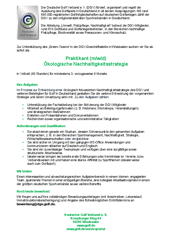 Im Prozess zur Entwicklung einer ökologisch fokussierten Nachhaltigkeitsstrategie des DGV und weiteren Beteiligten für Golf in Deutschland gestalten Sie die weitere Entwicklung der vorgenannten Strategie und deren Umsetzung aktiv mit.