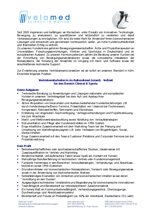 •Aktive Akquisition von Neukunden und Ausbau bestehender Kundenbeziehungen z.B. durch Kundenbesuche/Demo-Termine, Präsentation von Velamed bei Fachmessen, Kongressen, Netzwerktreffen, Seminaren und Workshops