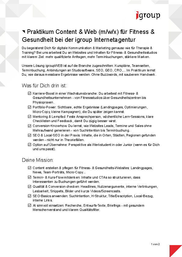 Bei uns arbeitest Du an Websites und Inhalten für Fitness- & Gesundheitsstudios mit klarem Ziel: mehr qualifizierte Anfragen, mehr Terminbuchungen, stärkere Marken. Unser Produkt igroupWEB ist auf die Branche zugeschnitten: Kurspläne, Teamseiten, Terminbuchung, Anbindungen an Studiosoftware, SEO, GEO, CRO,...