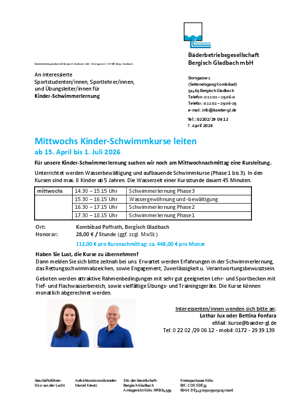Das Honorar pro Nachmittag ist 112,00 €. - Start ist Mittwoch, 15. April 2026. Letzter Kurstermin: 1. Juli 2026. Interessenten/innen melden sich per Mail (kurse@baeder-gl.de) oder telefonisch unter +49 2202 290612. (Detailinfos siehe pdf).