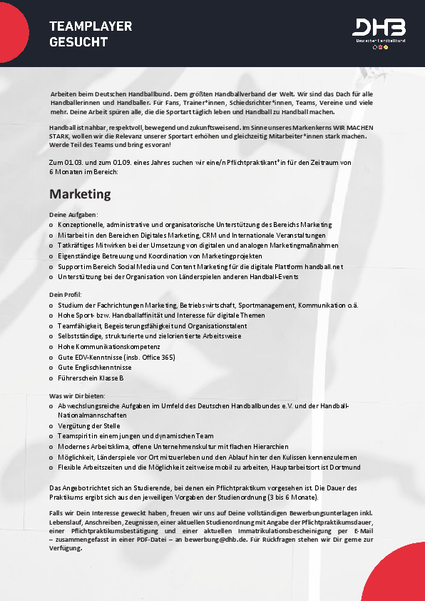 o Abwechslungsreiche Aufgaben im Umfeld des Deutschen Handballbundes e.V. und der Handball-Nationalmannschaften