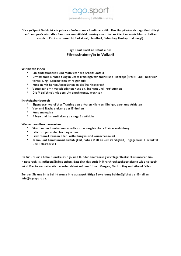 ago sport sucht ab sofort einen Fitnesstrainer/in