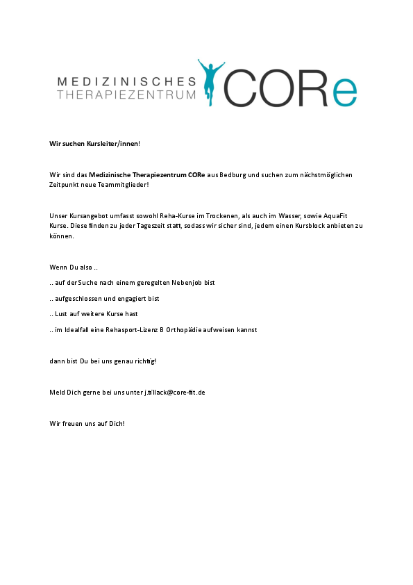 Wir sind das Medizinische Therapiezentrum CORe aus Bedburg und suchen zum nächstmöglichen Zeitpunkt neue Teammitglieder!