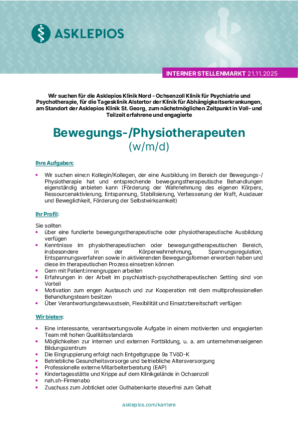 Bewerbungen sind möglich, solange die Stellenausschreibung auf der Asklepios Homepage veröffentlicht ist.