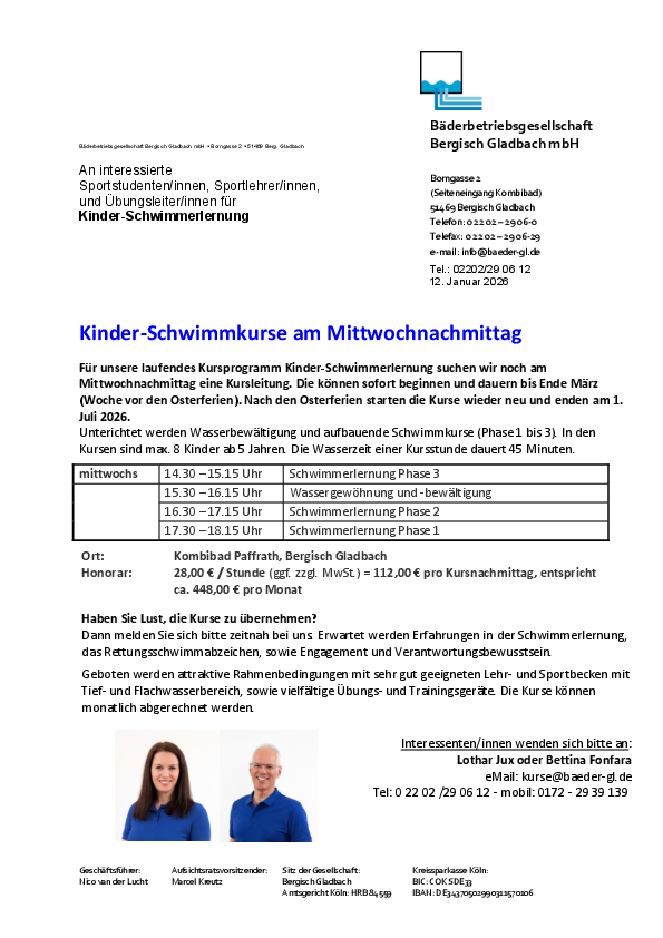 In unserem Kursprogramm Kinder-Schwimmerlernung haben wir eine Vakanz am Mittwochnachmittag, von 14.30 bis 18.30 Uhr. Die Kurse können sofort beginnen und enden dann Ende März. Nach den Osterferien starten die Kurse erneut und enden am 1. Juli 2026. Der Veranstaltungsort ist Bergisch Gladbach / Paffrath.