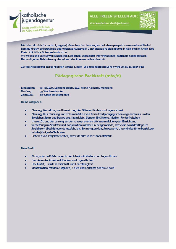 Möchtest du dich für und mit junge(n) Menschen für chancengleiche Lebensperspektiven einsetzen? Du bist kommunikativ, selbstständig und verantwortungsvoll? Dann engagiere dich mit uns in Köln und im Rhein-Erft-Kreis. KJA Köln - Gutes verlässlich tun.