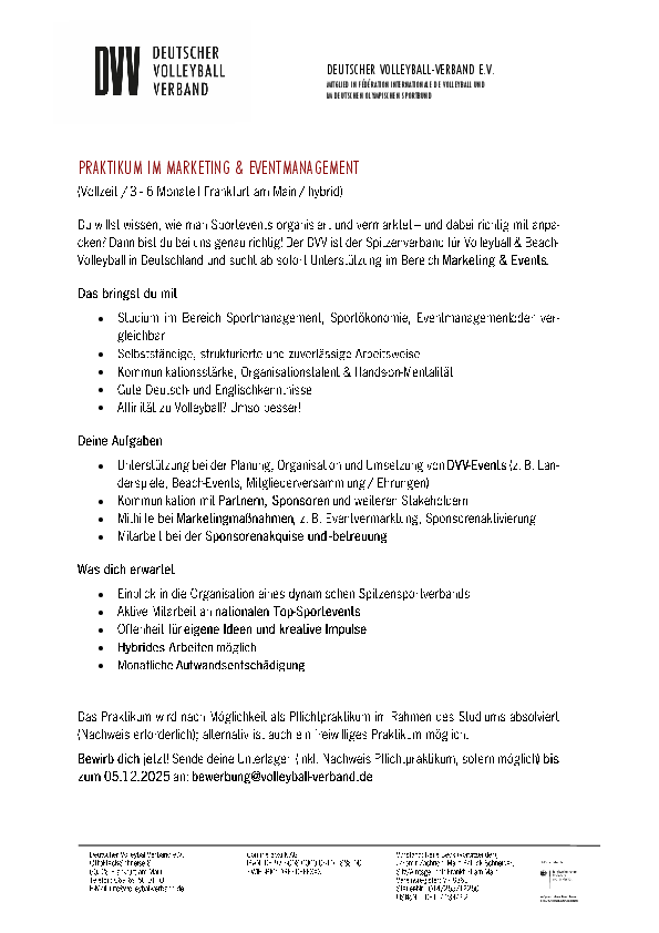 Bewirb dich jetzt! Sende deine Unterlagen (inkl. Nachweis Pflichtpraktikum, sofern möglich) bis zum 05.12.2025 an: bewerbung@volleyball-verband.de