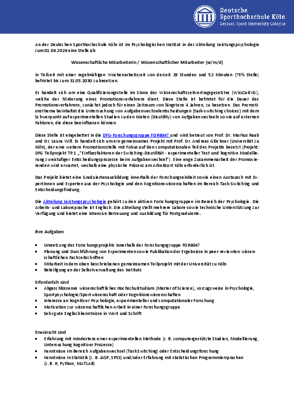 An der Deutschen Sporthochschule Köln ist im Psychologischen Institut in der Abteilung Leistungspsychologie zum 01.06.2026 eine Stelle als Wissenschaftliche Mitarbeiterin / Wissenschaftlicher Mitarbeiter (w/m/d) in Teilzeit mit einer regelmäßigen Wochenarbeitszeit von derzeit 29 Stunden und 52 Minuten (75% Stelle) befristet bis zum 31.05.2030 zu besetzen.