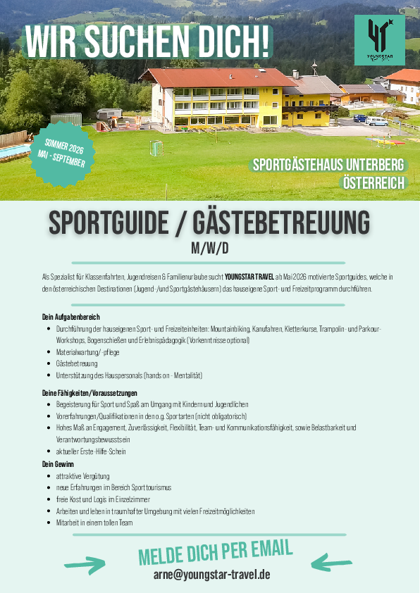 Als Spezialist für Klassenfahrten, Jugendreisen & Familienurlaube sucht YOUNGSTAR TRAVEL ab Mai 2026 motivierte Sportguides, welche in den österreichischen Destinationen (Jugend-/und Sportgästehäusern) das hauseigene Sport- und Freizeitprogramm durchführen (Klettern, Mountainbike, Kanu fahren, Parkour, ...)
