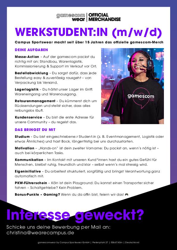 Campus Sportswear macht seit über 15 Jahren das offizielle gamescom Merchandise. Und wir suchen dich als Ergänzung für unser Team!