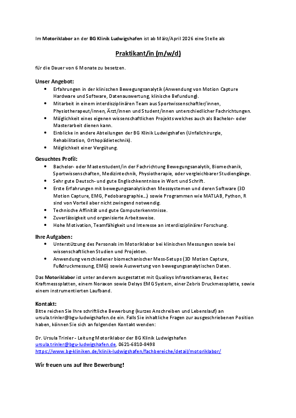 Im Motoriklabor an der BG Klinik Ludwigshafen ist ab März/April 2026 eine Stelle als Praktikant/in (m/w/d) für die Dauer von 6 Monate zu besetzen.