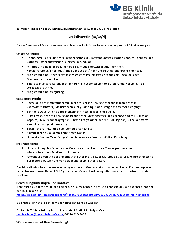 Im Motoriklabor an der BG Klinik Ludwigshafen ist für das Wintersemester 2026 (Start August-Oktober) eine Stelle als Praktikant/in (m/w/d) für die Dauer von 6 Monate zu besetzen.