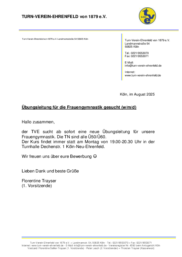 Hallo zusammen, der TVE sucht ab sofort eine neue Leitung für unseren Kurs zur Frauengymnastik. Die TN sind alle Ü50/60, die Gruppe besteht schon sehr lange. Übungsabend ist Montag von 19.00-20.30 Uhr in der Turnhalle der Eichendorff-Realschule (Dechenstr. 1, 50825 Köln-Neuehrenfeld)