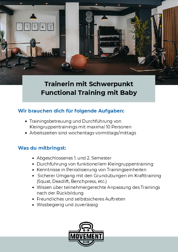 Der Movement Club ist ein Boutique Kursstudio (seit dem 1.10.2023) im Herzen von Köln Lindenthal mit Schwerpunkt Functional Training. Unsere Mission ist es, allen Menschen den gesunden Lebensstil näher zu bringen durch Bewegung. Alle unsere Functional Training Kurse sind von den Krankenkassen erstattungsfähig. Wir legen viel Wert auf eine familiäre Trainingsatmosphäre und individuelle Betreuung.