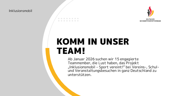 Ab Januar 2026 suchen wir im Rahmen des Projekts „Inklusionsmobil – Sport vereint!“ 15 engagierte Teammember im Rahmen der Ehrenamtspauschale in ganz Deutschland.