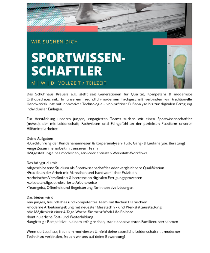 Zur Verstärkung unseres jungen, engagierten Teams suchen wir einen Sportwissenschaftler (m/w/d), der mit Leidenschaft, Fachwissen und Feingefühl an der perfekten Passform unserer Hilfsmittel arbeitet.