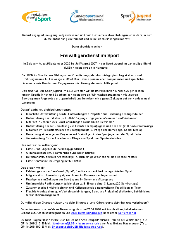 im Zeitraum August/September 2026 bis Juli/August 2027 in der Sportjugend im LandesSportBund (LSB) Niedersachsen in Hannover!