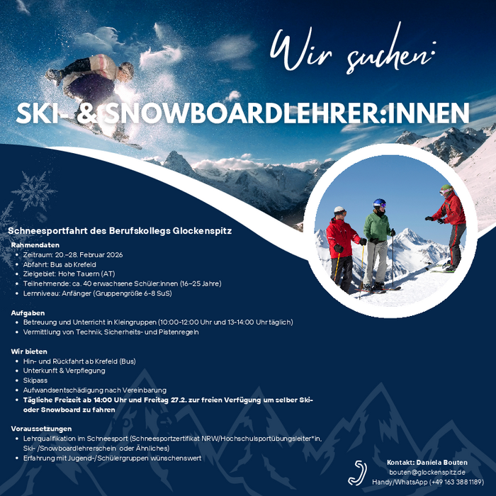 Für unsere schulische Schneesportfahrt des Berufskollegs Glockenspitz Krefeld ins Skigebiet Hohe Tauern vom 20.–28.02.2026 suchen wir zwei Skilehrer:innen und zwei Snowboardlehrer:innen zur Unterstützung unseres Lehrkräfteteams. Siehe PDF.