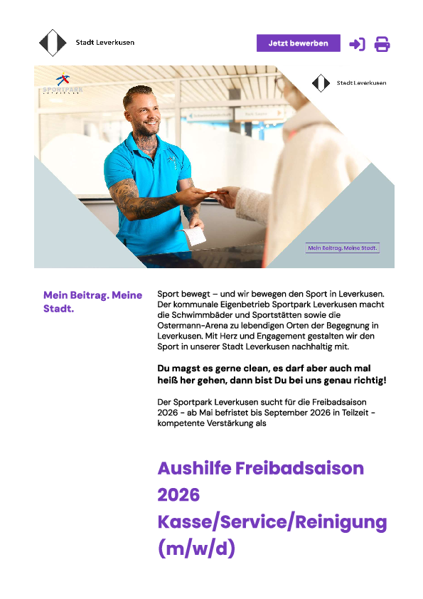 Der Sportpark Leverkusen sucht für die Freibadsaison 2026 - ab Mai befristet bis September 2026 in Teilzeit - kompetente Verstärkung als
