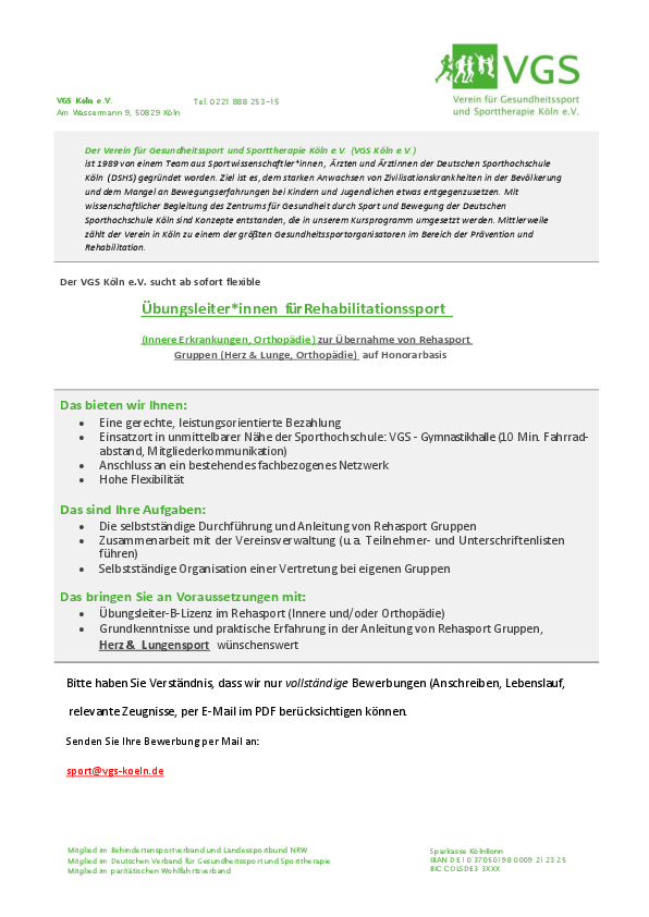 Der VGS e.V. sucht zum schnellstmöglichen Zeitpunkt Trainer*innen für den Rehabilitationssportbereich.