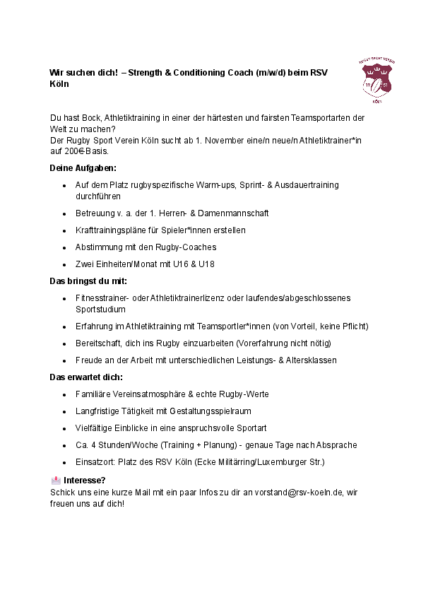 Bei Interesse oder Fragen bitte eine kurze Bewerbung oder Anfrage per E-Mail an: vorstand@rsv-koeln.de