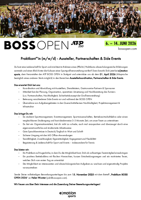 Du hast eine Leidenschaft für Sport und möchtest im Rahmen eines (Pflicht-) Praktikums abwechslungsreiche Erfahrungen sammeln und einen Blick hinter die Kulissen einer Sportgroßveranstaltung werfen? Dann bewirb Dich jetzt bei e|motion sports, dem Veranstalter der ATP BOSS OPEN in Stuttgart und unterstütze uns ab dem 01. April 2026 (Absprache bezüglich eines anderen Starts möglich) in den Bereichen Ausstellerkoordination, Partnerschaften & Side Events.