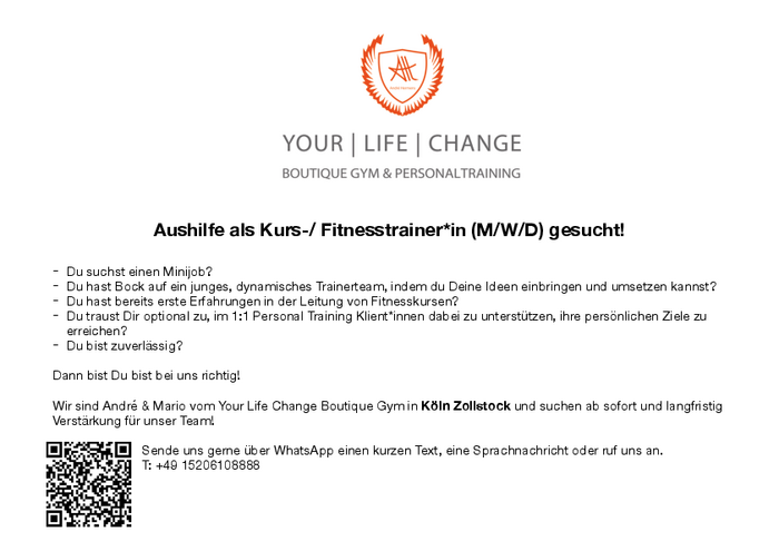 Wir sind André & Mario vom Your Life Change Boutique Gym in Köln Zollstock und suchen ab sofort und langfristig