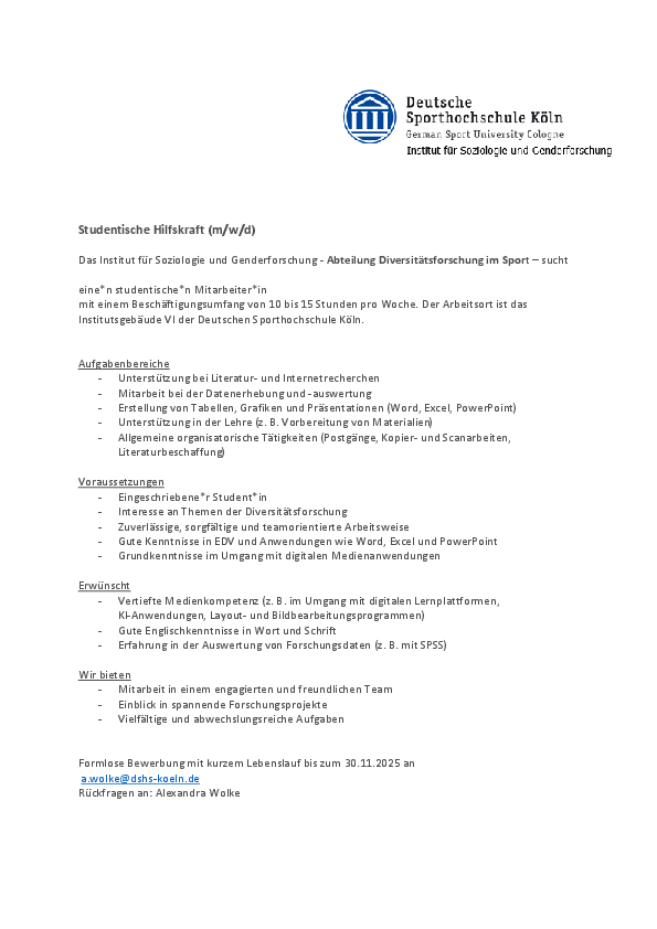 eine*n studentische*n Mitarbeiter*in mit einem Beschäftigungsumfang von 10 bis 15 Stunden pro Woche. Der Arbeitsort ist das Institutsgebäude VI der Deutschen Sporthochschule Köln.