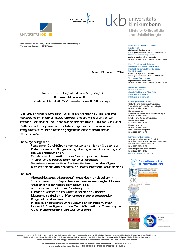 Die Klinik und Poliklinik für Orthopädie und Unfallchirurgie am Universitätsklinikum Bonn sucht zum nächstmöglichen Zeitpunkt eine/n wissenschaftliche/n Mitarbeiter/in (m/w/d). Das UKB ist ein Krankenhaus der Maximalversorgung mit über 8.000 Mitarbeitenden und verbindet Spitzenmedizin mit exzellenter Forschung und Lehre. Der Schwerpunkt der ausgeschriebenen Stelle liegt auf der Durchführung wissenschaftlicher Studien bei Patientinnen und Patienten mit Blutgerinnungsstörungen mit Fokus auf Gelenkgesundheit, der Aufbereitung und Publikation von Forschungsergebnissen sowie der Umsetzung einer multizentrischen Studie mit bundesweiten Dienstreisen. Geboten werden moderne Arbeitsbedingungen mit klinischer Tätigkeit, Home-Office-Anteilen, strukturierter Einarbeitung (u. a. in der Gelenksonographie) sowie ggf. die Möglichkeit zur weiteren wissenschaftlichen Qualifikation.